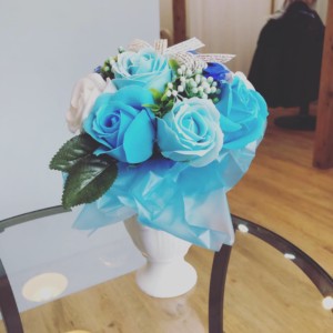 シャボンフラワーといって、なんと石鹸で作られたブーケなんです。すごい!!洗ったりするのが目的でがなく、ブリザーブフラワーのように枯れないでずっと飾れてなおかつシャボンの香りも楽しめるブーケらしいです。